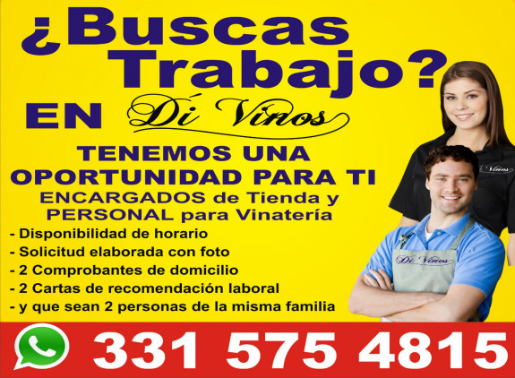 ENCARGADOS Vinaterías parejas, familiares Oblatos, $14,000.- mensuales más comisión. Contratación inmediata, prestaciones ley. WhatsApp 33 1575-4815