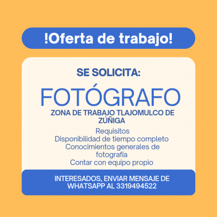SE SOLICITA FOTÓGRAFO PARA TRABAJAR EN LEVANTAMIENTO DE OBRA, REQUISITOS: CONOCIMIENTO BÁSICO DE FOTOGRAFÍA, VIVIR O TENER FÁCIL ACCESO A TLAJOMULCO, CONTAR CON EQUIPO PROPIO, DISPONIBILIDAD DE TIEMPO COMPLETO.INTERESADOS ENVIAR CURRÍCULUM Y PORTAFOLIO A dme.mzurita@gmail.com