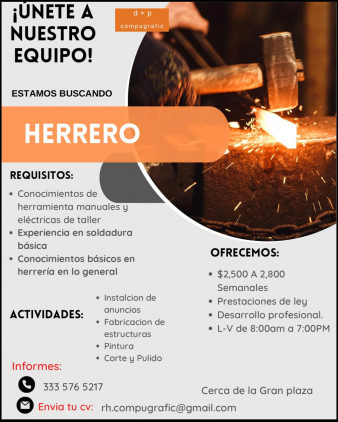 Empresa de diseño e impresion solicita Herrero y Ayudante de HerreroRequisitos: