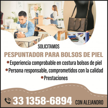 SE solicita PESPUNTADOR (A) para Bolsos de Piel *Con experiencia comprobable en costura de bolsos de piel *Trabajo estable *Buen ambiente laboral y prestaciones de ley. -Buscamos persona responsable, hábil y comprometida con la calidad -Edad: 25 a 45 años. 33 1358-6894 con Alejandro