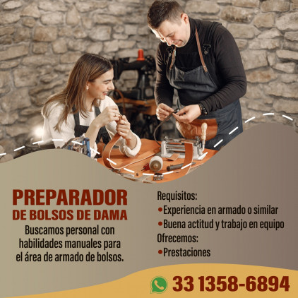 PREPARADOR (A) DE BOLSOS DE DAMA Buscamos personal con habilidades manuales para el área de armado de bolsos. Requisitos: -Experiencia en armado o similar -Buena actitud y trabajo en equipo -Persona proactiva y responsable -Edad de 20 a 40 años- Ofrecemos: *Prestaciones de ley *Trabajo estable *Buen ambiente laboral. WhatsApp 33 1358-6894