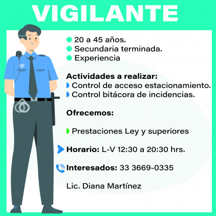 Edad 20 a 45 años. Secundaria terminada. Experiencia un año puesto similar. Disponibilidad de horario. Actividades a realizar: Control de acceso estacionamiento. Seguir protocolos de seguridad. Registro entradas y salida. Manejo de conmutador. Control bitáctora de incidencias. Ofrecemos: Prestaciones Ley y superiores. Pago quincenal. Salario: $10,000.00 -$12,000.00 mensual. Horario L- V 12:30 a 20:30 hrs. Interesados: 33 3669-0335 Lic. Diana Martínez.