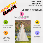 ¡¡¡REMATE!!! VESTIDO DE NOVIA Corte princesa Talla extra ajustable. Color Ivory Oferta de $35,000 a solo $18,000 Seminuevo en perfecto estado. Pruébatelo sin compromiso. Informes a los teléfonos: 3318450527 / 3311531108
